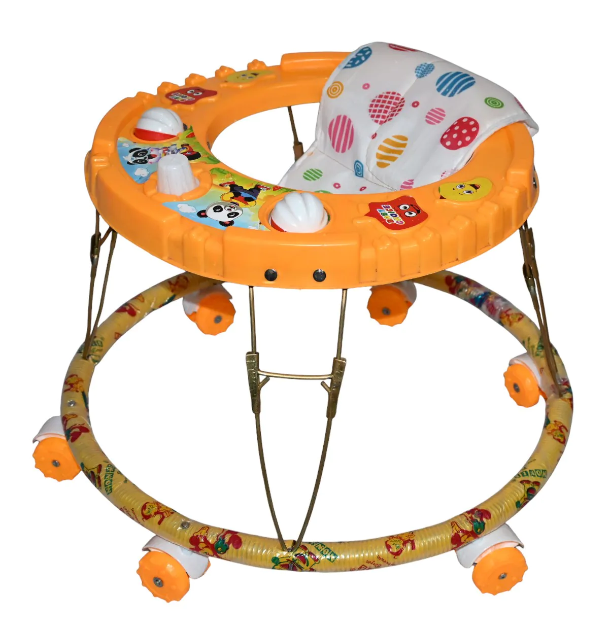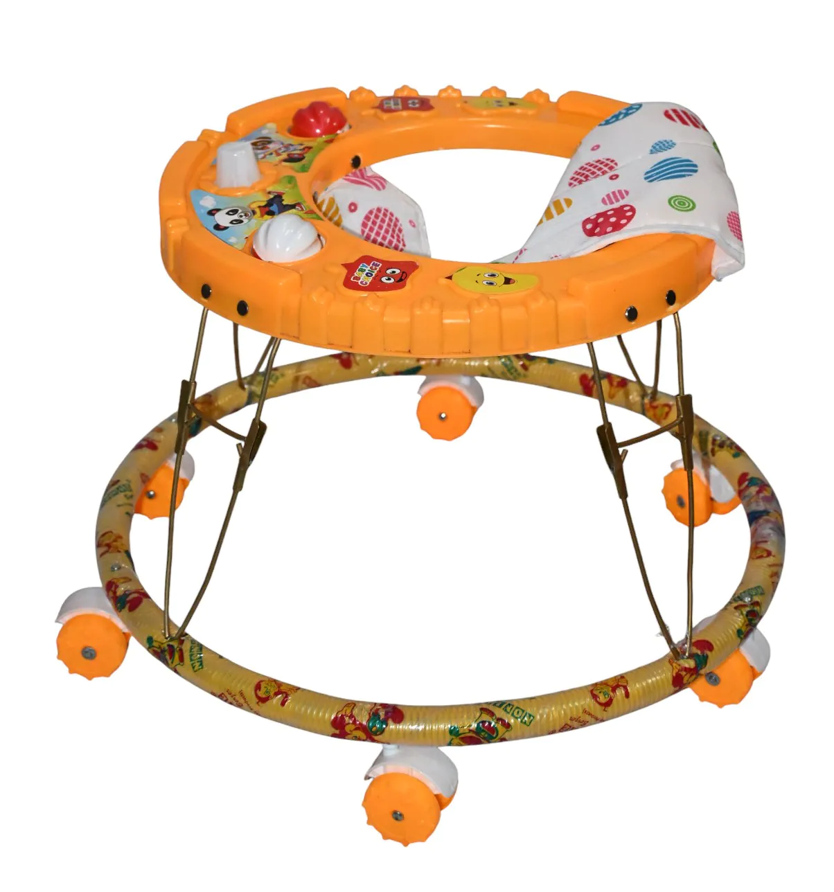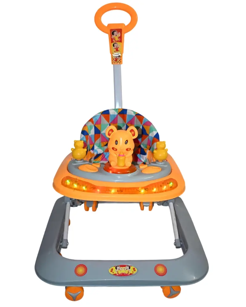 - DESIGN FEATURES: Vibrant red and yellow walker with geometric pattern seat cushion and engaging activity tray featuring a cute bear figure and toy ducks