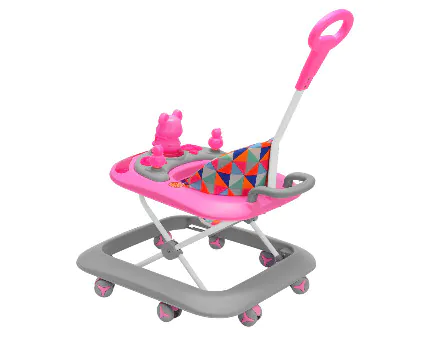 - DESIGN FEATURES: Vibrant red and yellow walker with geometric pattern seat cushion and engaging activity tray featuring a cute bear figure and toy ducks